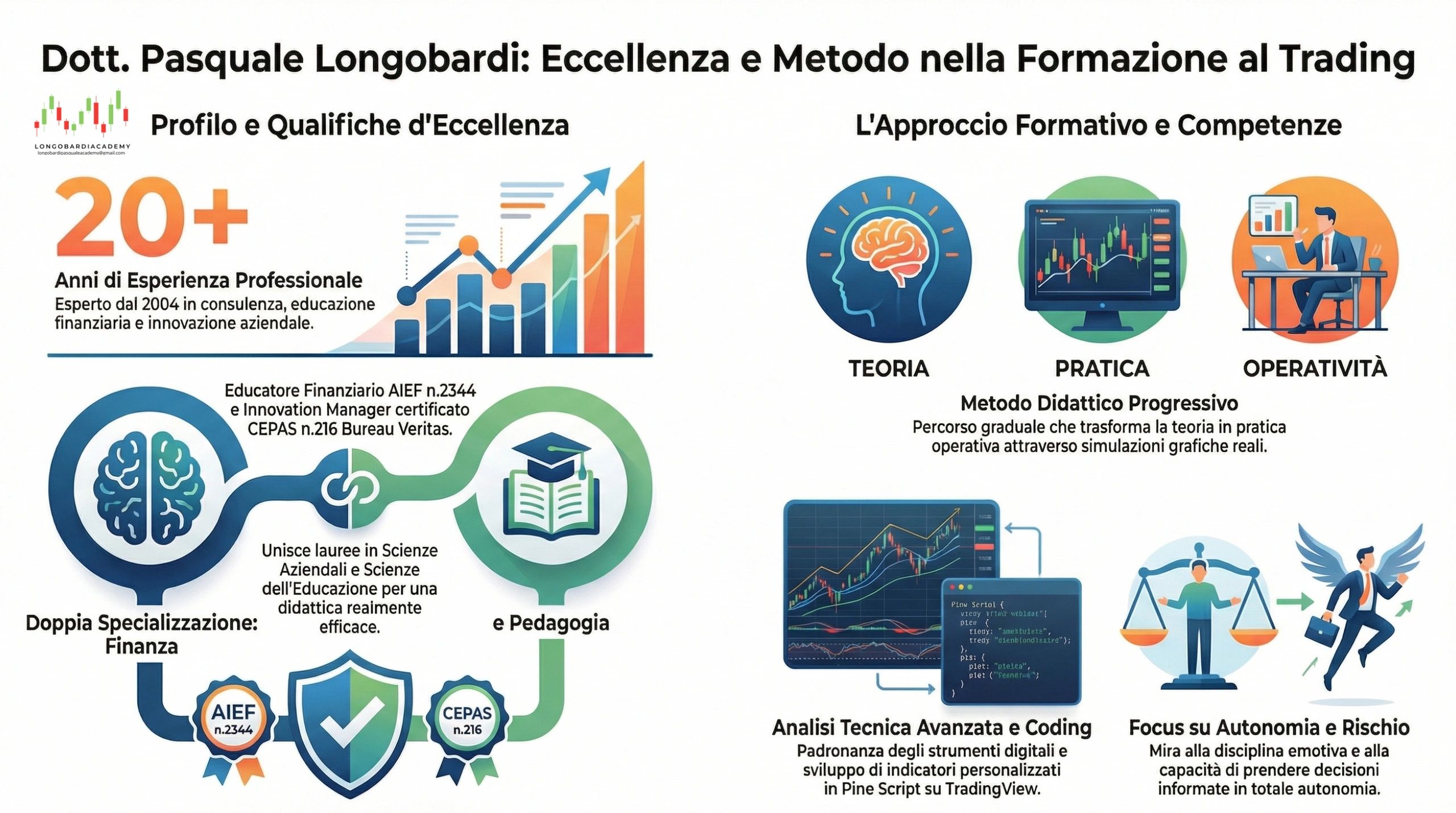 Il Dott. Pasquale Longobardi è un professionista della formazione finanziaria con oltre vent'anni di esperienza nel settore della consulenza, dell'educazione e dell'innovazione aziendale. Laureato con il massimo dei voti in Scienze Aziendali con Specializzazione Finanziaria e seconda laurea in Scienze dell'Educazione e della Formazione, unisce in modo originale la solidità della preparazione economico-finanziaria con le competenze pedagogiche e comunicative necessarie per una didattica efficace.